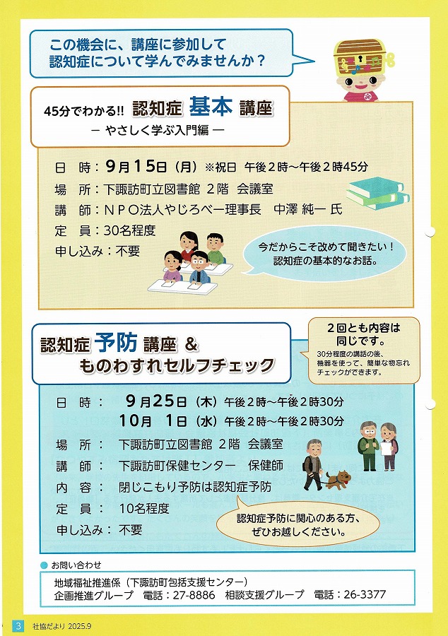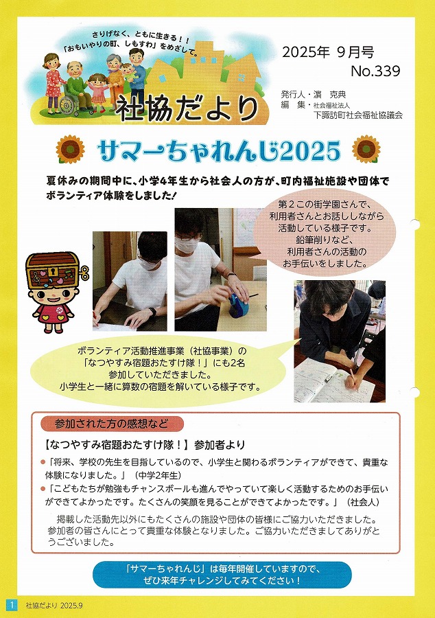 よりわかりやすく、より充実した社協だよりにしていきたく、2012年5月号より「クローズアップしもすわ」に別冊という形で挟み込みとなりました。 このページでは、社協だよりの最新号を掲載しております。 No.338 2025.7.27発行