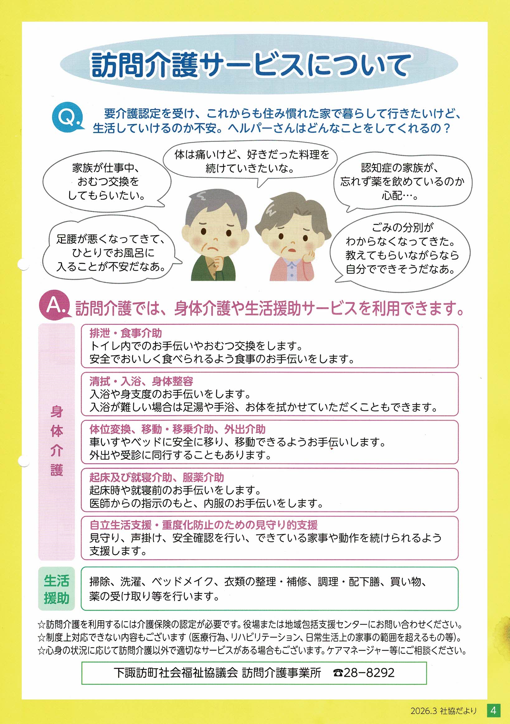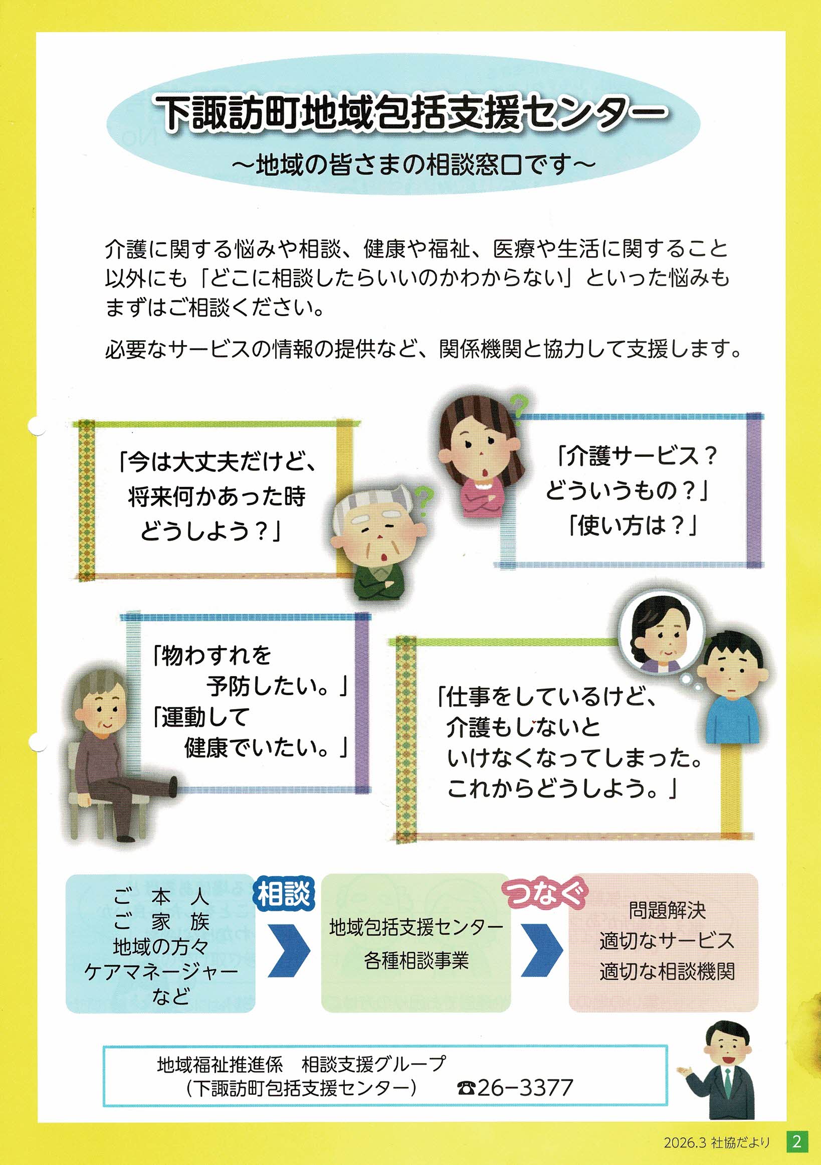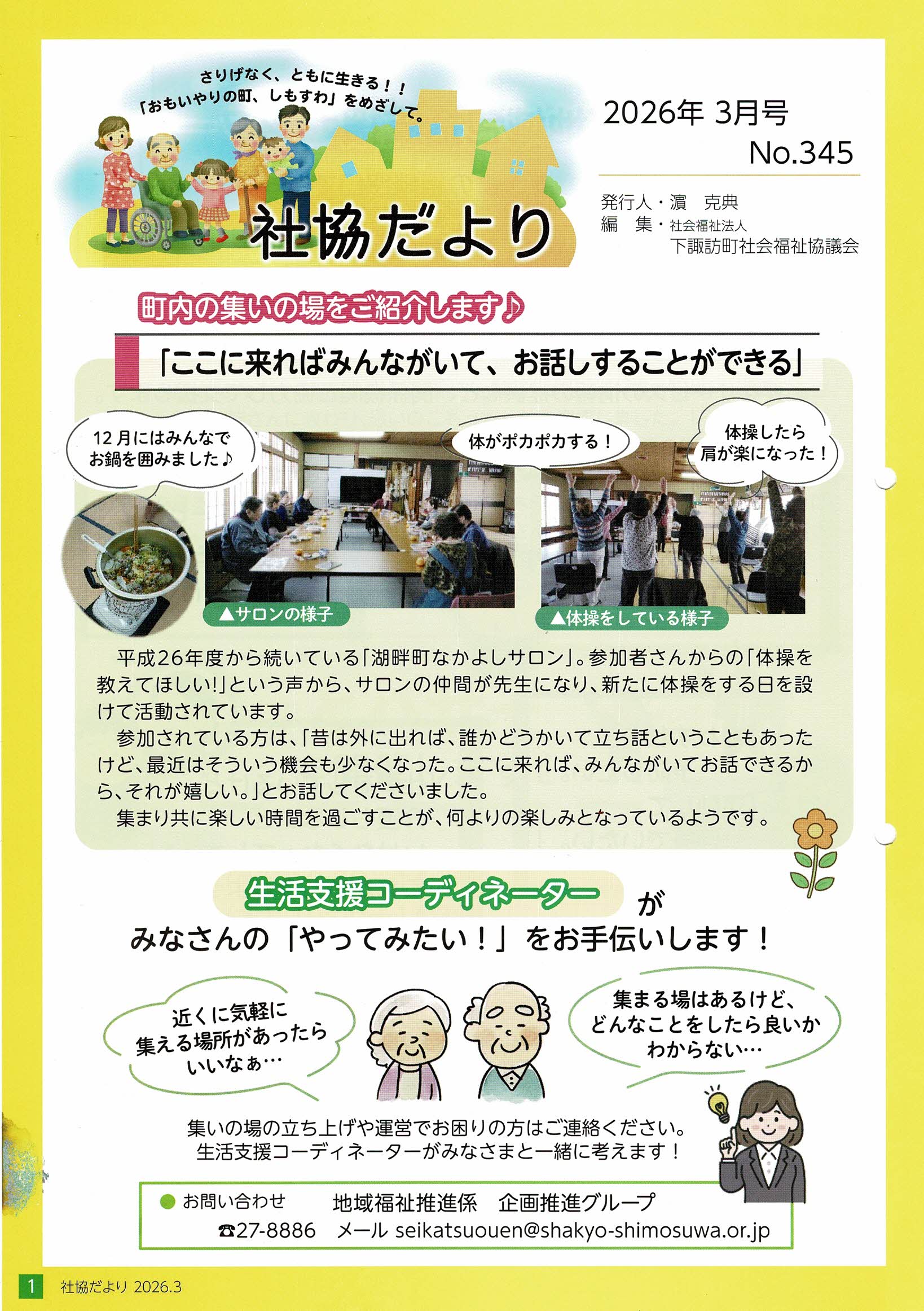 よりわかりやすく、より充実した社協だよりにしていきたく、2012年5月号より「クローズアップしもすわ」に別冊という形で挟み込みとなりました。 このページでは、社協だよりの最新号を掲載しております。 No.344 2026.2.26発行