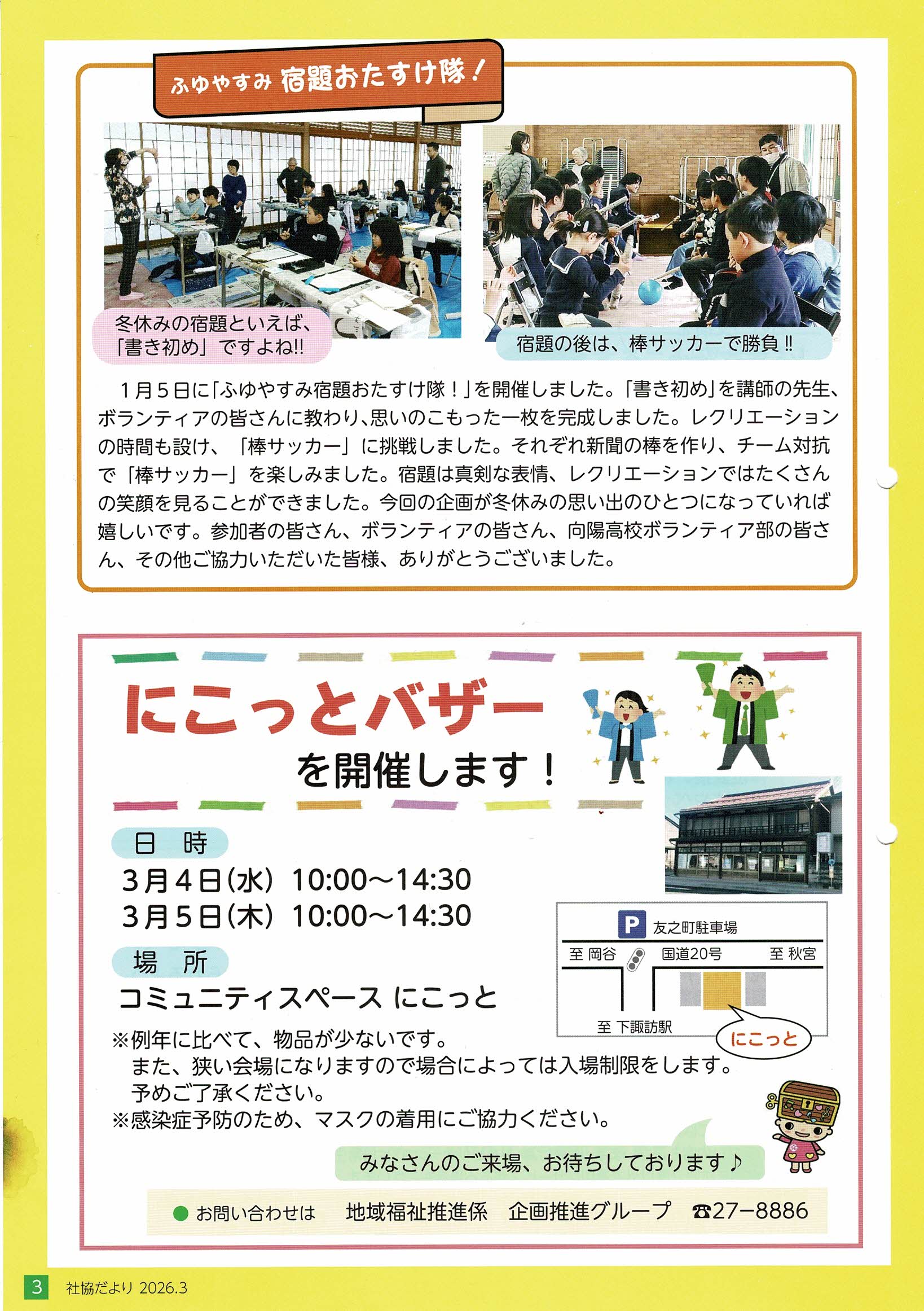 よりわかりやすく、より充実した社協だよりにしていきたく、2012年5月号より「クローズアップしもすわ」に別冊という形で挟み込みとなりました。 このページでは、社協だよりの最新号を掲載しております。 No.344 2026.2.26発行